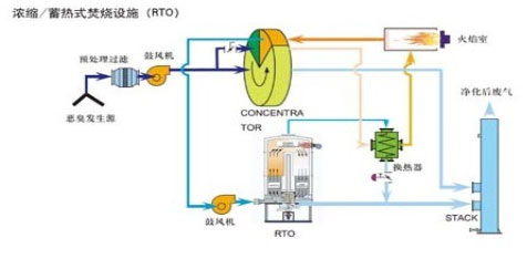 RTO主體結構由燃燒室、陶瓷填料床和切換閥等組成。該裝置中的蓄熱式陶瓷填充床換熱器可使熱能得到較大限度的回收,熱回收率大于95%,處理VOC時不用或使用很少的燃料。若處理低濃度廢氣,可選裝濃縮裝置,以降低燃燒消耗。